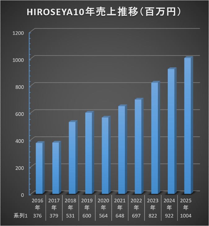 HIROSEYAはこの10年間で売上を約3倍に成長させてきました。